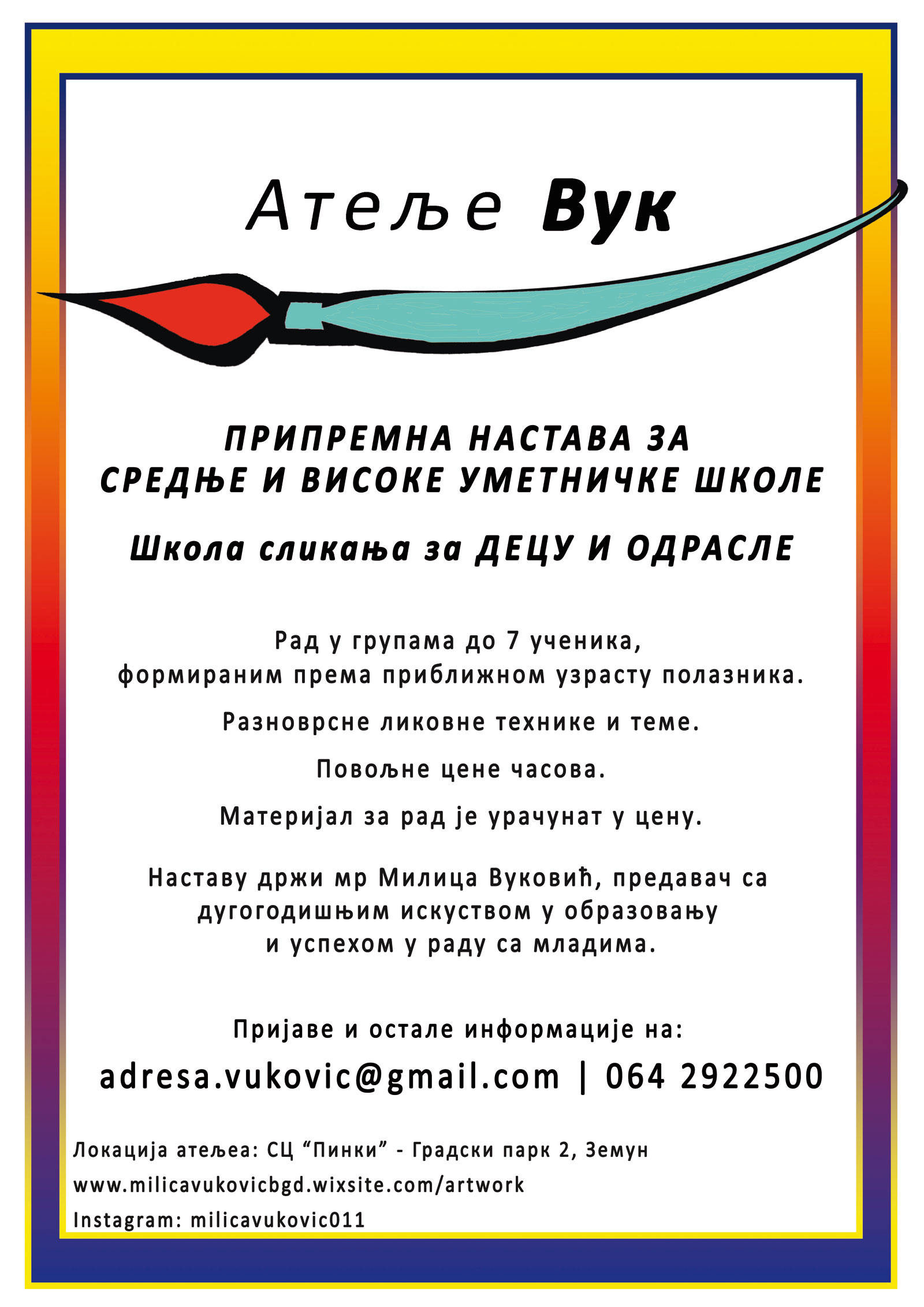 Pripremnu nastavu za srednje i visoke umetničke škole i Školu slikanja za decu i odrasle.