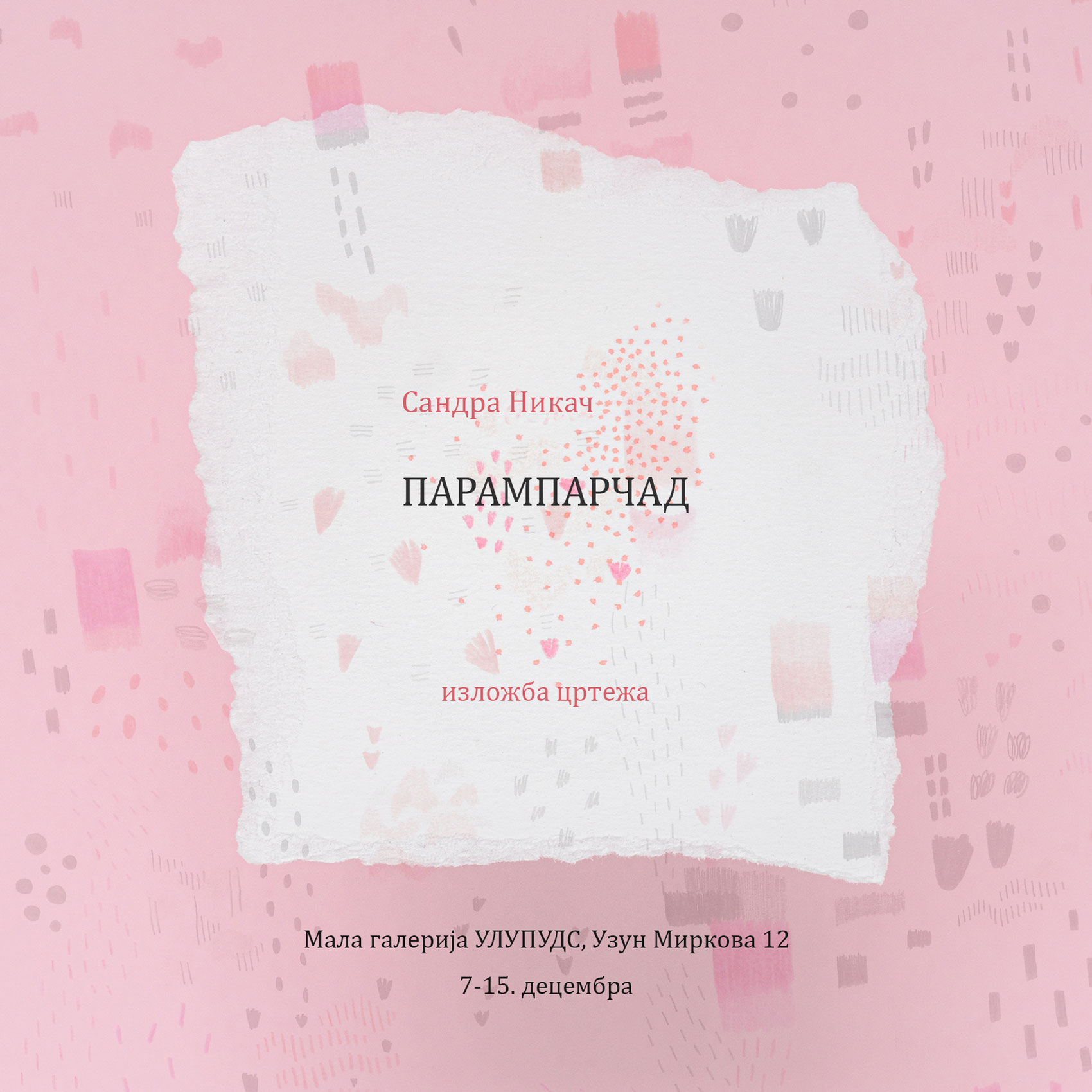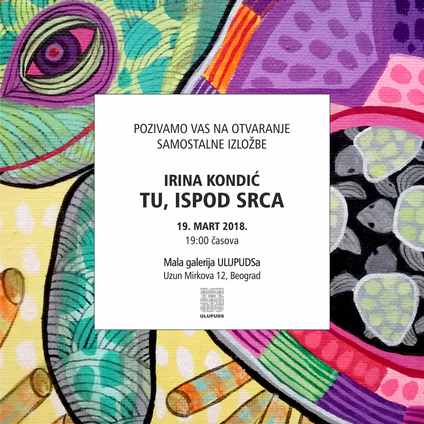 Izložba Irine Kondić Tu, ispod srca otvorena je u ponedeljak, 19. marta 2018. godine u 19.00 sati.