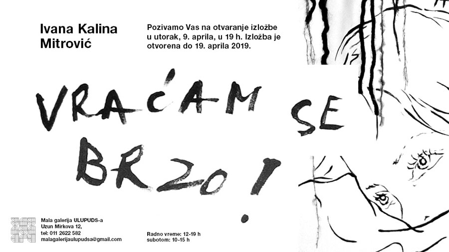Izložba Vraćam se brzo Ivane Kaline Mitrović otvorena je 09. aprila 2019. godine u 19.00 sati.