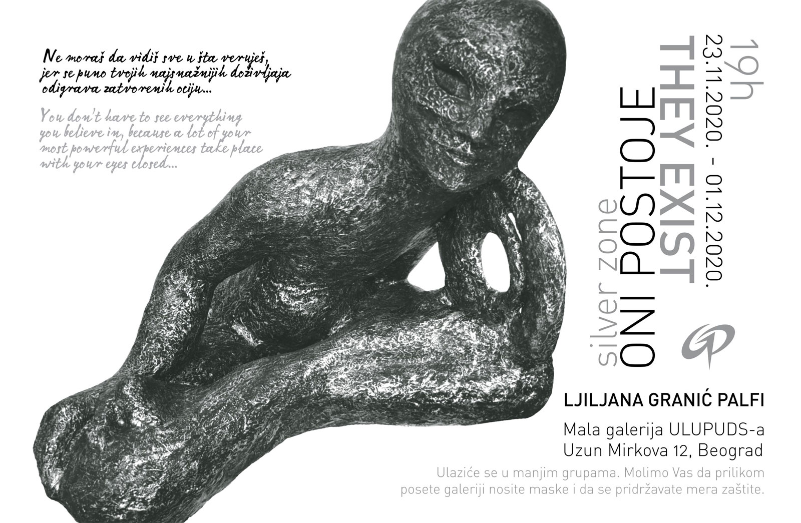Izložba Oni postoje Ljiljane Granić-Palfi održana je od 23. novembra do 01. decembra 2020. godine.