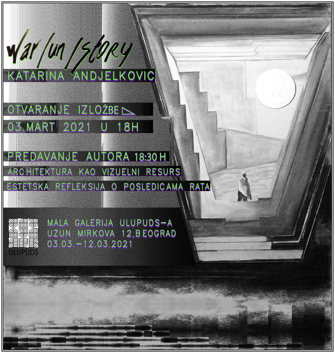 Izložba dr Katarine Anđelković, d.i.a. War [Un]Story održana je od 03 do 12. marta 2021. godine.