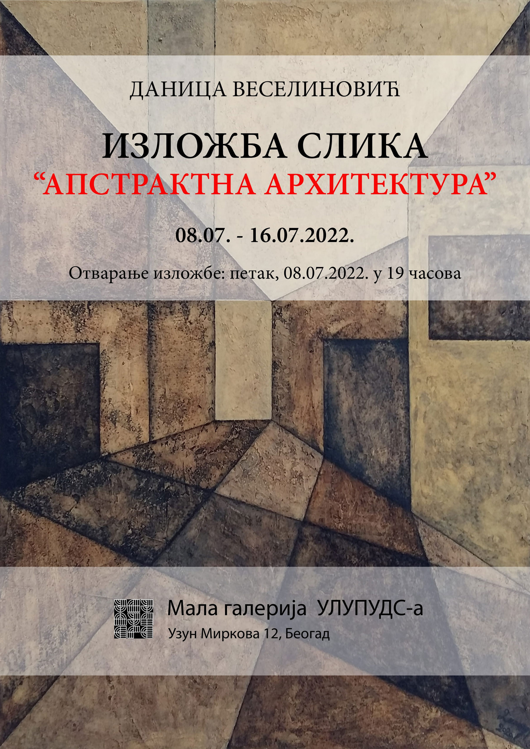 Izložba slika Apstraktna arhitektura Danice Veselinović održana je od 08 do 16. jula 2022. godine.