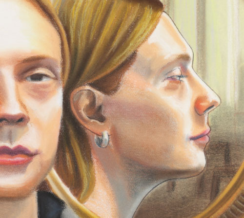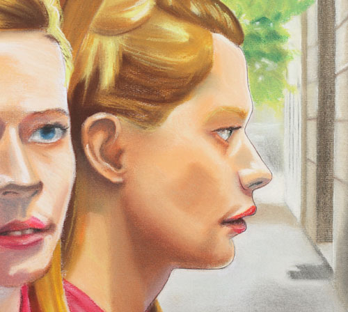 Ovoj temi i pitanjima autor pristupa koristeći dupli portret, predstavljajući modele anfas i iz profila. Model okrenut ka nama je postavljen ispred i bliži nam je, dok je model iz profila njegov odraz u ogledalu. Međutim, tamo gde se očekuje da model anfas bude jasan, on je često nedovršen i mutan. S druge strane, model iz profila iako u drugom planu, izoštreniji je i detaljniji. Autor ovo čini namerno, kako bi prikazujući likove suprotno od očekivanog, ilustrovao pitanja kojima se bavi. Prednji modeli stoga deluju izolovano i izopšteno iz okruženja, dok su zadnji zarobljeni u ramu ogledala.