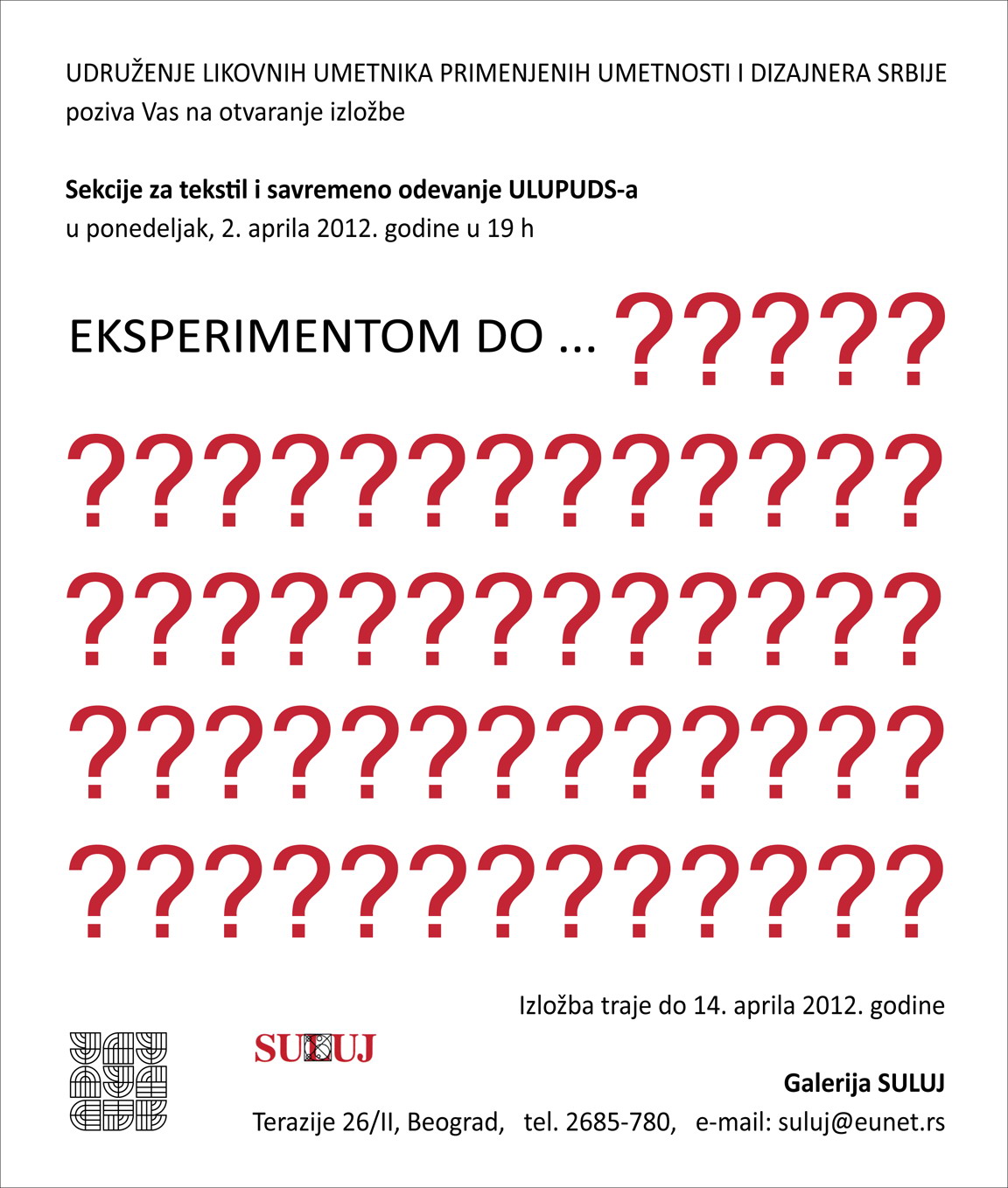 Izložba Sekcije za tekstil i savremeno odevanje ULUPUDS-a EKSPERIMENTOM DO... održava se u Galeriji SULUJ od 02. do 14. aprila 2012. godine.